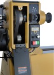 Станок подключается к однофазной сети 220В, но имеет встроенный частотный преобразователь и, соответственно, трехфазный асинхронный двигатель. Электроника позволяет в широком диапазоне изменять скорость вращения шпинделя, обеспечивая при этом одинаково высокий крутящий момент. Частота оборотов задается небольшой поворотной рукояткой и, для удобства настройки, отображается в цифровом виде на символьном дисплее. Вспомогательная функция блока – изменение направления вращения простым переключателем. Для удобства управления пульт сделан выносным с магнитной фиксацией – его можно разместить в любом месте, где это будет удобно оператору.