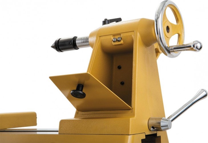 Для увеличения крутящего момента при обтачивании деталей большого диаметра можно переустановить ремень на шкивах. Натяжение производится рычагом с передней стороны бабки, который фиксируется винтовым зажимом с удобной ручкой. Есть делительное приспособление на 48 позиций и отдельный от него механизм блокировки шпинделя для удобства замены оснастки. Сама бабка подвижная вдоль станины и, кроме того, поворотная на 180° (это позволяет работать «над полом» с деталями, диаметр которых больше, чем просвет до станины). Задняя бабка с отсеком для хранения принадлежностей.