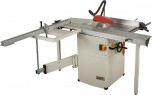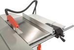 Основа конструкции пилы – металлическая тумба, внутри которой установлены асинхронный трехфазный двигатель, механизмы регулировки по высоте и углу наклона пильного модуля (он выполнен из чугунной отливки) и пылесборный кожух со 100-миллиметровым патрубком подключения к вытяжной установке. Рабочий стол чугунный, вдоль него проходит жесткая цилиндрическая направляющая, по которой перемещается параллельный упор с эксцентриковой фиксацией – эти решения полностью соответствуют профессиональному стандарту. Рабочая поверхность может быть увеличена за счет установки расширителя и удлинителя, сделанных из листовой стали – они штатно поставляются вместе с пилой.