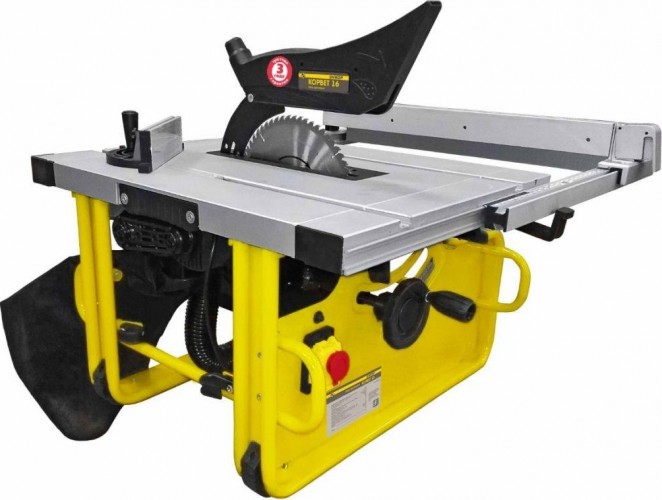 Положение удлинителя стола и параллельного упора надёжно удерживаются быстрозажимными устройствами. Для выполнения торцо-усовочных работ рабочий стол оборудован двумя пазами установки углового упора слева и справа от пильного диска. Устройство подвески силового агрегата обеспечивает оперативную настройку и надёжную фиксацию положения наклона и высоты вылета пильного диска. Усиленная конструкция станины обеспечивает свободный доступ к узлам и агрегатам при обслуживании и беспрепятственное охлаждение электродвигателя.