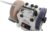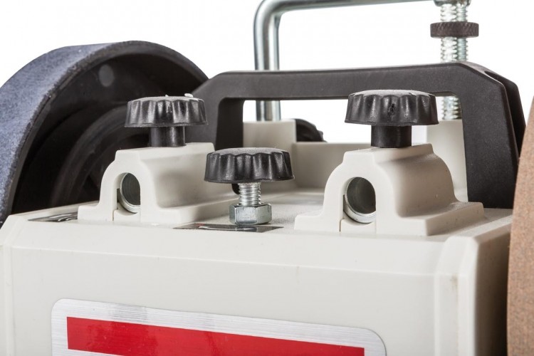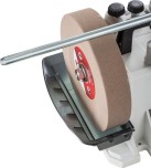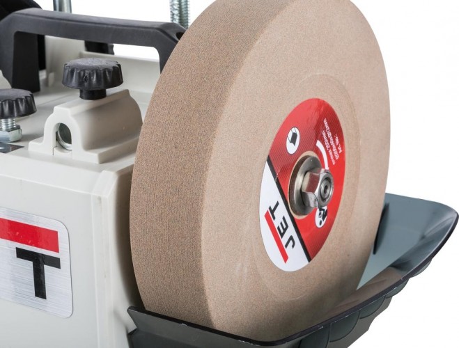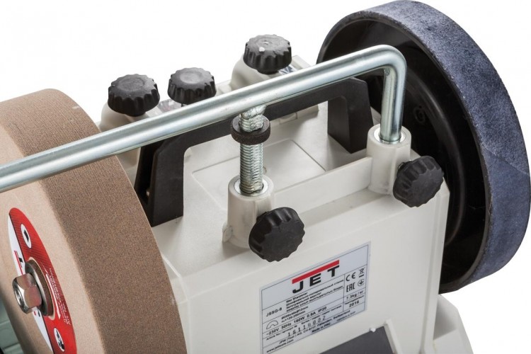 В комплект входят держатель инструмента с винтовыми зажимами и кронштейн-направляющая для работы с ним или с другими вспомогательными приспособлениями (большой ассортимент представлен под маркой JET и поставляется за дополнительную плату). В зависимости от выполняемой работы, кронштейн монтируют с одной или другой стороны корпуса, что позволяет шлифовать от кромки к обуху или наоборот. Для регулировки угла заточки его перемещают, меняя расстояние до поверхности точильного камня.