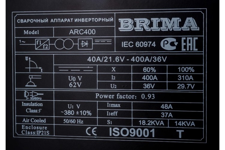 ARC-400 BRIMA - инверторный сварочный аппарат, предназначенный для ручной дуговой сварки штучными плавящимися покрытыми электродами (данный способ сварки в соответствии с ИСО 4063-90 имеет следующее сокращение – MMA Manual Metal Arc). Аппарат идеально подходит для выполнения профессиональных задач и позволяет получить качественное неразъёмное соединение. Серия аппаратов BRIMA линейки ARC широко применяется в различных отраслях промышленности (нефтегазовая, машиностроительная, химическая промышленности, кораблестроение и т.д.). Устройство работает от промышленной сети с питающим напряжением 380 В.