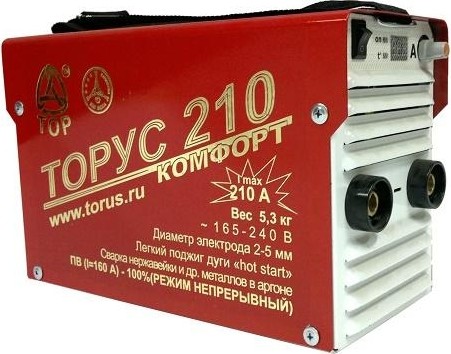 Так же в этом аппарате понижен до 20 А начальный сварочный ток. Введение этих дополнений создает возможность комфортной работы для сварщика особенно в режиме TIG (аргонно-дуговая сварка), а также в малом и среднем диапазонах сварочных токов в режиме ММА (сварка штучным электродом). В дополнение к этому ТОРУС-210 отличается от предшественника увеличенным максимальным сварочным током.