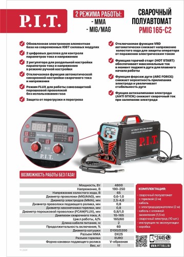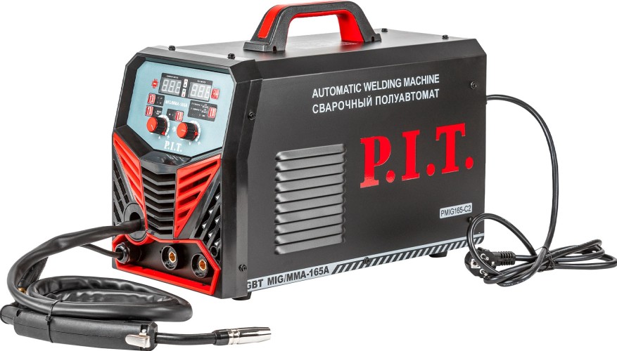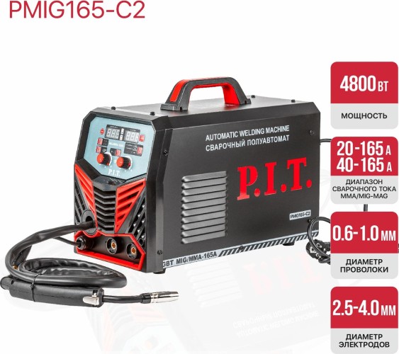 Универсальный инверторный сварочный полуавтомат PMIG165-C2 сочетает в себе сразу два типа сварки: MMA – ручная дуговая сварка плавким покрытым электродом, MIG/MAG – полуавтоматическая сварка проволокой в среде инертного и активного газов. FLUX (FCAW) – в режиме MIG/MAG предусмотрена возможность смены полярности и сварки самозащитной порошковой сварочной проволокой без использования газов.