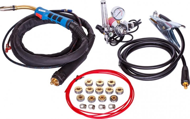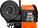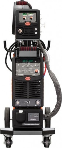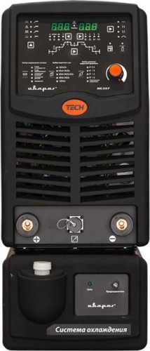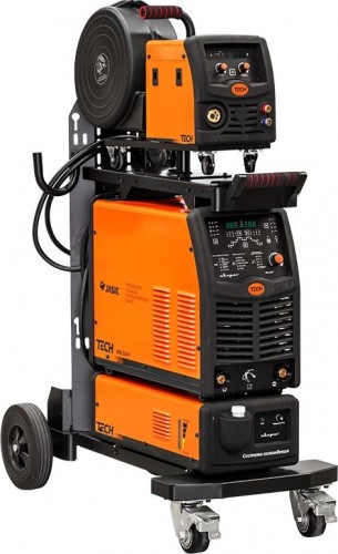 TECH MIG 350 P (N316) состоит из выносного подающего механизма, источника питания и блока жидкостного охлаждения. Все оборудование располагается на удобной тележке с площадкой для крепления баллона. Панель подающего механизма оснащена индикаторами тока и напряжения. На блоке кулера расположен индикатор уровня жидкости, а подключение блока производится без дополнительных проводов.