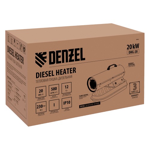 Дизельная тепловая пушка Denzel DHG-20 предназначена для прямого нагрева воздуха в цехах, ангарах, хранилищах и других нежилых помещениях с хорошей вентиляцией. Пушка служит эффективным источником тепла в полярных экспедициях. Пригодится также на строительной площадке для прогрева бетона, просушки стен и разморозки траншей.