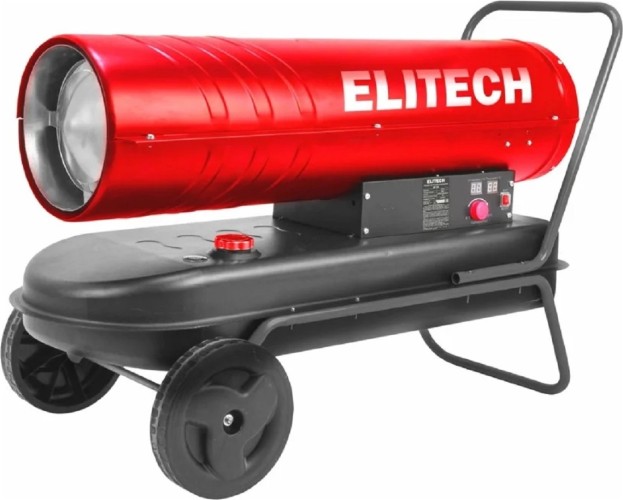 Дизельная тепловая пушка прямого нагрева ELITECH ДП 50 мощностью 50 кВт и производительностью 1100 куб.метров/час предназначена для работы на открытых/полузакрытых площадках и временного обогрева/просушки хорошо проветриваемых помещений или с работающей приточно-вытяжной вентиляцией. Площадь обогрева пушки составляет около 550 кв.метров. Материал корпуса – сталь.