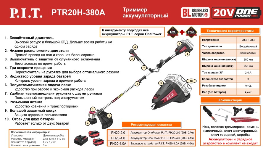 Триммер аккумуляторный P.I.T. PTR20H-380A Solo входит в семейство инструментов единой аккумуляторной системы OnePower20V. Аккумуляторы этой серии имеют защиту от перегрузок, перегрева и глубокого разряда. Благодаря Li-Ion технологии практически отсутствует саморазряд. К инструменту подходят все аккумуляторы серии OnePower20V