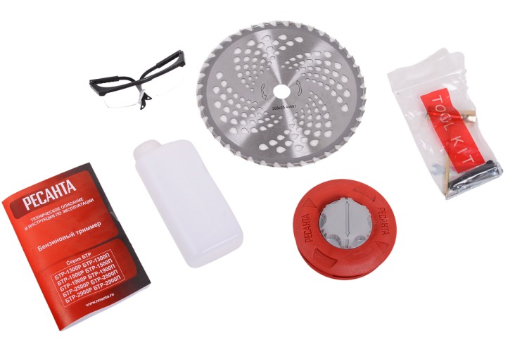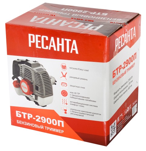 Триммер бензиновый БТР-2900П Ресанта. Новая модель представляет собой отличный инструмент для скашивания травы и современный вариант ручной косы. Косить траву, особенно если она высокая, триммером очень удобно. Как правило, владельцы участков отдают приоритет бензиновым моделям, ведь не на каждой даче есть электричество, а провода создают дополнительное неудобство. Новая модель триммера Ресанта отличается тем, что в комплектацию входят ранцевый ремень, диск 40 TP, а также защитные очки. Кроме того, у БТР-2900П Ресанта штанга неразъемная. Обратите внимание! Топливную смесь следует приготавливать из бензина с октановым числом не менее 92 и специального масла. Необходимо использовать высококачественное масло, предназначенное для двухтактных двигателей с воздушным охлаждением. Запрещается использование масла, предназначенного для 2-х тактных двигателей с водяным охлаждением (для лодочных моторов)! Пропорция приготовления указывается производителем масла. Если пропорция не указана, то используется 1:40.