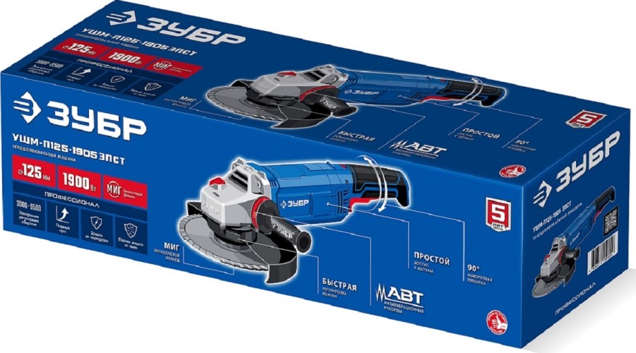 Двуручная УШМ с максимальной в линейке машин 125 мм ЗУБР мощностью 1900 Вт и регулировкой оборотов максимально эффективна для всех видов работ - резки металла, кирпича, керамики, зачистки, шлифовки и обдирки. Системы защиты пользователя и изделия, а также поддержание рабочих характеристик при любой нагрузке позволяют выполнять любую предстоящую работу проще и быстрее
