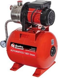 Станция насосная AUTOMATICO 1001 INOX, QUATTRO ELEMENTI. Для снабжения загородных домов и коттеджей, а также для увеличения давления воды в сетях с низким давлением. Quattro Elementi Automatico 1001 INOX – это мощный агрегат (1кВт). Корпус выполнен из нержавеющей стали, а гидроаккумулятор, объемом 19 литров, из углеродистой стали. Поэтому при всей своей прочности и надежности, насосная станция весит всего 10,2кг, но осталась довольно компактной. Давление Automatico 1001 INOX составляет от 1,5 до 3 бар.