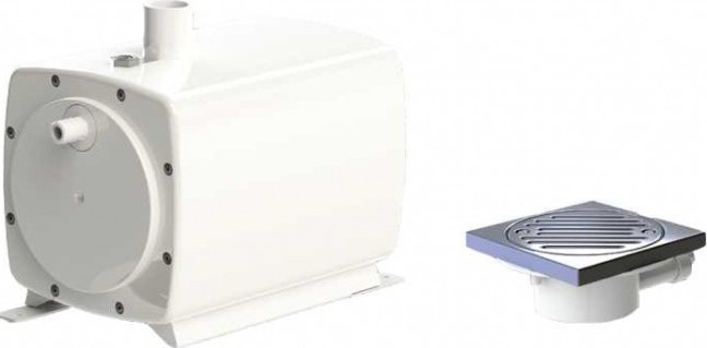 Состоит из всасывающего насоса и специального трапа для облицовки плиткой или гибким покрытием. Позволяет установить современный душ без порога и поддона в любом месте без гравитационной канализации — идеально для ванных комнат, мансард, подвалов или перепланировок.