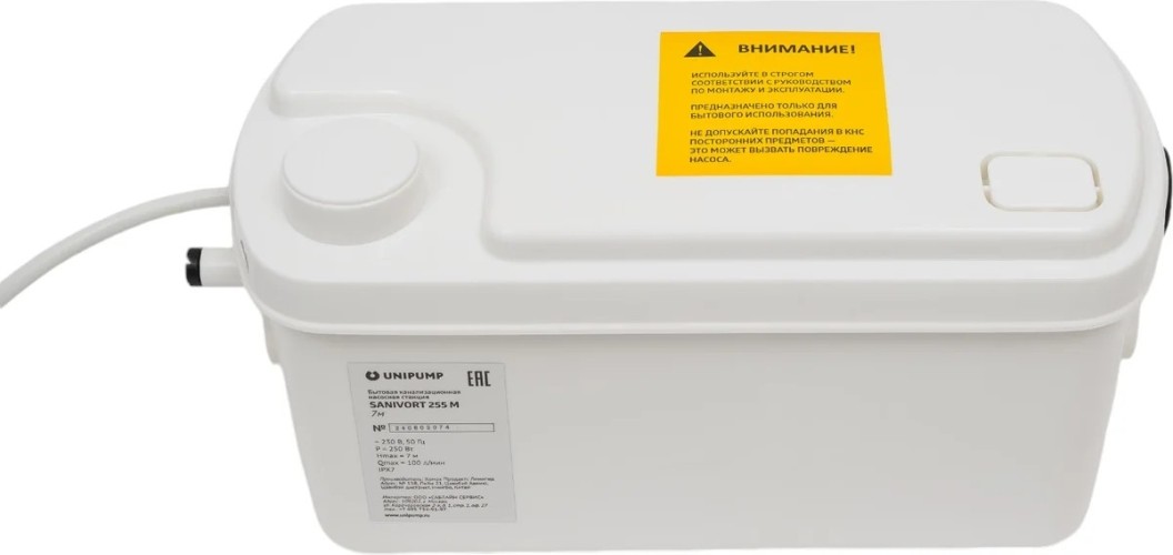 Бытовая канализационная насосная станция SANIVORT 255 M (напор 7 метров) — позволяет удалять сточные воды от раковин и душевых кабин, находящихся ниже уровня коллектора канализационной системы, а также в удаленных местах, где невозможно или нецелесообразно организовать канализацию самотеком. На верхней крышке станции имеется вентиляционное отверстие. Дополнительно КНС имеет отдельный вход с боку для приема конденсата от кондиционера. Также этот вход может использоваться для аварийного слива жидкости из КНС. Максимальная горизонтальная длина сброса — 70 м. Макс. температура перекачиваемой жидкости, °С +65 (до +80 не более 4 часов). Присоединительный размер: боковой вход: 2х40 мм; напорный патрубок (выход): 23/28 мм. Электрокабель — Н05VV-F 3G 0,75 мм² с вилкой, длина — 1.7 м.