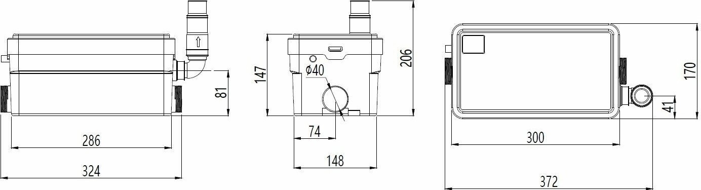 Бытовая канализационная насосная станция SANIVORT 255 M (напор 9 метров) — позволяет удалять сточные воды от раковин и душевых кабин, находящихся ниже уровня коллектора канализационной системы, а также в удаленных местах, где невозможно или нецелесообразно организовать канализацию самотеком. На верхней крышке станции имеется вентиляционное отверстие. Максимальная горизонтальная длина сброса — 70 м. Макс. температура перекачиваемой жидкости, °С +75 (до +80 не более 4 часов). Два входа для раковины/душа DN 40, выходное отверстие DN 23/28. Электрокабель — Н05VV-F 3G 0,75 мм² с вилкой, длина — 1.7 м.
