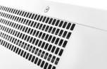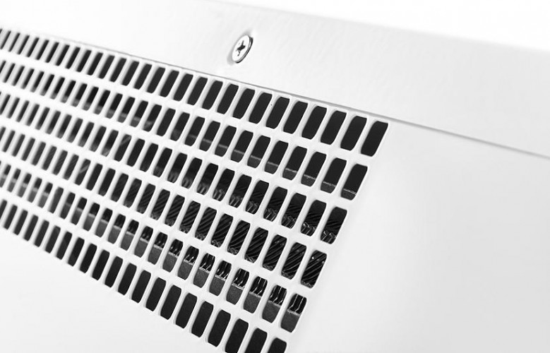 Передняя панель без перфорации блокирует распространение шума от вентиляционных колес направляя его в потолок а не в проходящих людей, что делает завесу значительно тише аналогов в классическом корпусе.